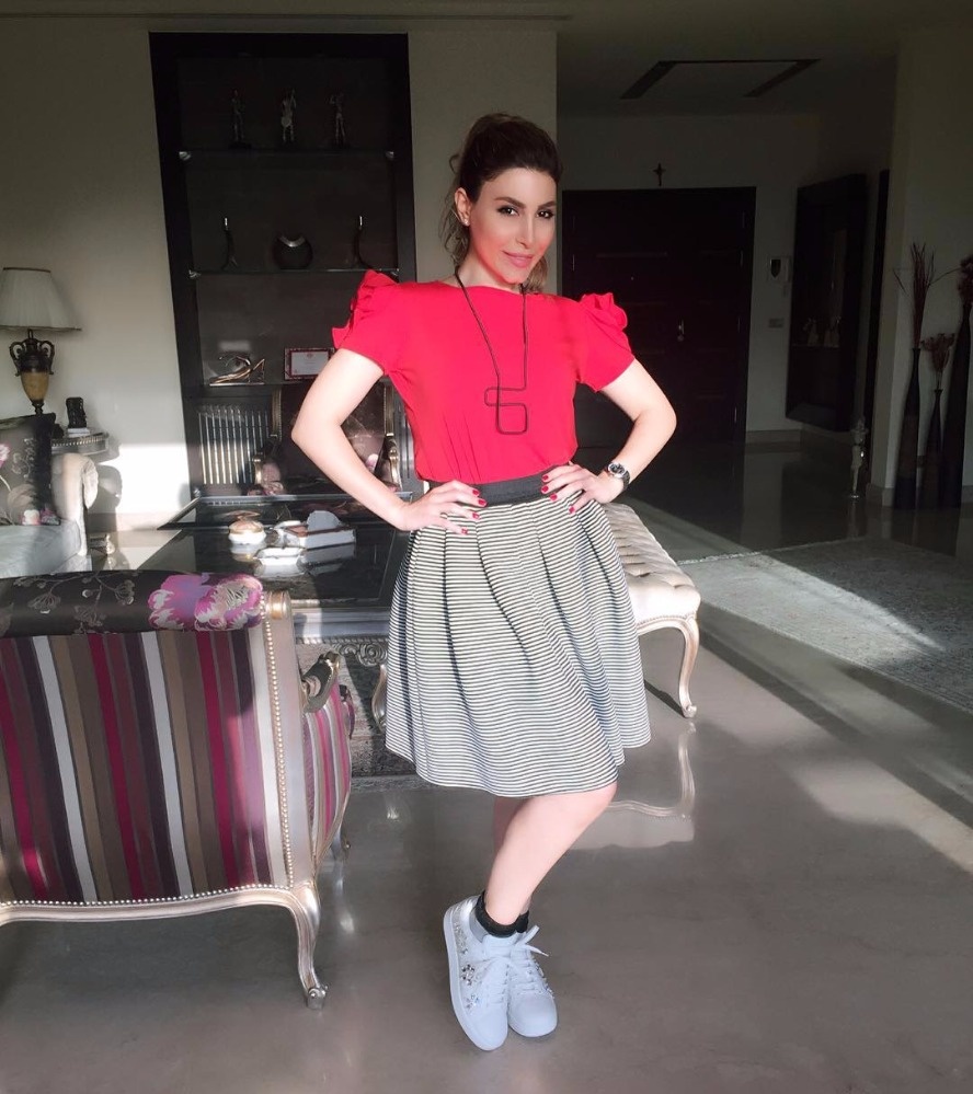 فظهرت بالعديد من إطلالاتها بالتنورة الواسعة على شكل حرف A بألوانٍ مختلفة كالبني والكحلي وبالتقليمات، ونسقتها مع توب بسيط بلونٍ بارز كالأصفر والفوشيا، وانتعلت معها حذاءً بالأسلوب الرياضي بالنقوش والتصاميم المتنوعة.