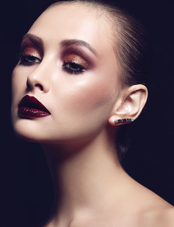 ظلال عيون غنية بالأصباغ القزحية والمعدنية، وبألوان الحجارة الكريمة، والذهبي، والبرونزي، والنحاسي لجمال متلألئ....