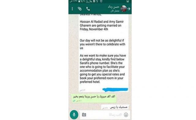 تداول مستخدمون لشبكات التواصل الاجتماعي صورة مسرّبة من الدعوة لحضور حفل زفاف الممثّلين المصريّين حسن الرداد وايمي سمير غانم، في سياق تأكيد الشائعة التي انتشرت أخيراً حول زواجهما في بداية شهر تشرين الثاني (نوفمبر) المقبل في منطقة الجونة.