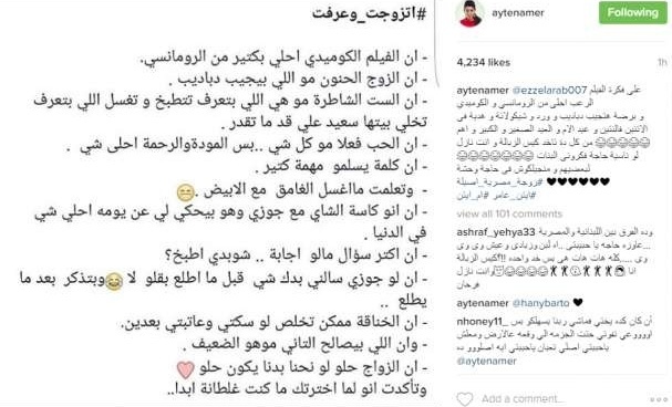 ونشرت عبر حسابها على إنستغرام صورة من مقولات عن الزواج وعلقت: "لو ناسية حاجة فكروني، البنات لبعضيهم، ومنجيلكوش في حاجة وحشة، زوجة مصرية أصيلة".
