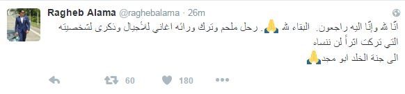 كما كتب نجم أراب آيدول حازم الشريف على صفحته الرسمية على "تويتر": "أبو مجد أستاذ الكل وموسيقار الأغنية مارح ننساك ولا لحظة ومارح ننسى على بابي واقف قمرين وأحلى…".