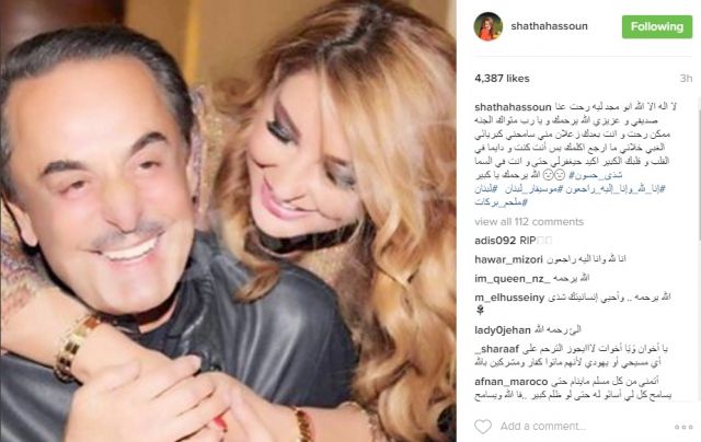 وأردفت المطربة العراقية الصورة بتعليق جاء فيه: "لا اله إلّا الله ابو مجد ليه رحت عنا صديقي وعزيزي الله يرحمك، ويا رب مثواك الجنة. ممكن رحت وانت بعدك زعلان مني سامحني كبريائي الغبي خلاني ما ارجع اكلمك بس أنت كنت ودايما في القلب وقلبك الكبير اكيد حيغفرلي حتى وانت في السما.. الله يرحمك يا كبير".