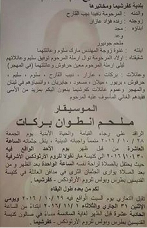 ويتم يتقبل التعازي غداً السبت ويومي الأثنين والثلثاء المقبلين، ابتداءً من الساعة الحادية عشرة قبل الظهر لغاية السادسة مساءً في صالون الكنيسة.