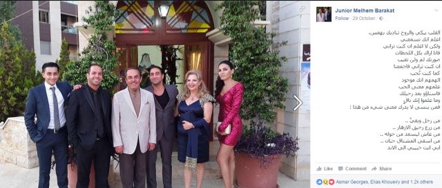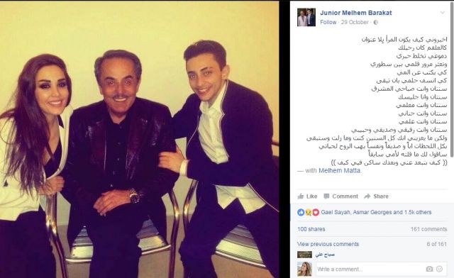 ونشر جونيور، عبر حسابه الخاص على "فايسبوك" صورة جمعته بوالده، وعلّق: "ماذا اكتب. ماذا اقول. لقد سَهُدَت كلماتي بفراقك ،اجتاحتني الكلمات في ضعفك وفي مرضك... ابكاني مرضك واشقاني.. اي صباحٍ بدونك انتظر. ماذا تعني ايامي من بعدك يا مهجة قلبي وعنواني.. ابي وطني وامي فخراً واخوتي اعتزاز. اعلم اني احلم حين اقول ارجوك لا ترحل. فرحيلك مزق احشائي. يا جبلا بقيت وستبقى. عنواناً مشجونٌ مرموقٌ في اعماقي. احتاجك دوماً فانت بقلبي ما حييت. بأمان الله وتكون نفسك في السماء مطمئنة."