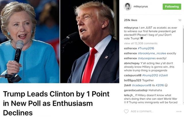 وشاركت سايرس صورة بالأبيض والأسود لكلينتون من مرحلة مراهقتها، معلقةً: "كانت هيلاري أول ناطق باسم طلاب كلية "وليسلي" منذ تأسيسها، وتخرجت مع مرتبة الشرف. زملاؤها صوّتوا لها لإلقاء الخطاب (في حقل التخرج) لأنها كانت ذكية جداً وملهمة".