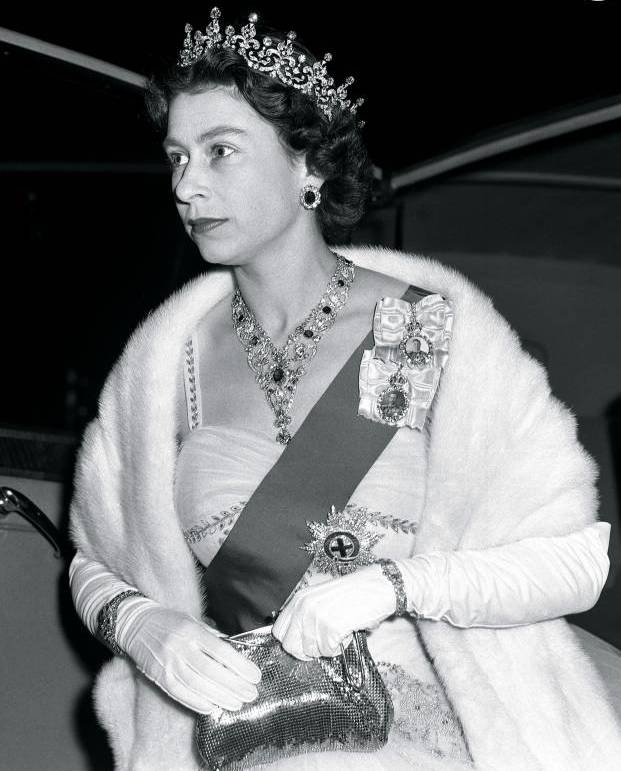 تضيف الملكة إليزابيث الثانية هذه المجوهرات الذهبية المرصعة بماسات باللون البحري إلى إطلالتها منذ أن قدّمتها لها دولة البرازيل كهدية لمناسبة تتويجها.