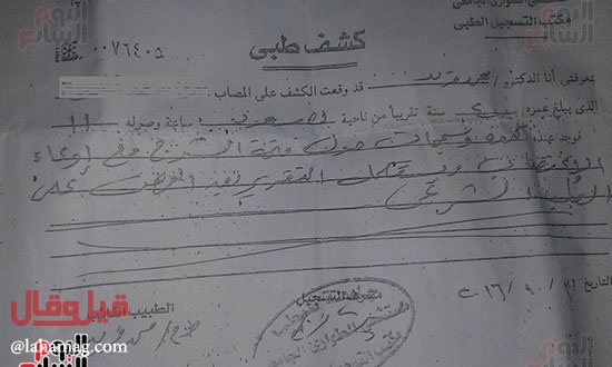 وعلى الفور لجأ الوالد الى مستشفى طنطا الجامعي، حيث كشف الطبيب الشرعي محمد فريد على الطفل وأكّد "وجود كدمة وسحجات حول فتحة الشرج مع ادعاء الاغتصاب."