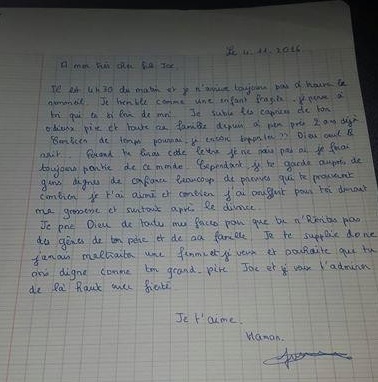 وكتبت: "رايحة عند المحامي تأكتب وصيتي، وأهم شي فيها انو إذا متت ممنوع بتاتاً وضد إرادتي يجو على الدفن او العزاء او القبر جورج الراسي وكلّ افراد عائلته باستثناء إبني جو، وهني اكيد سبب بموتي".