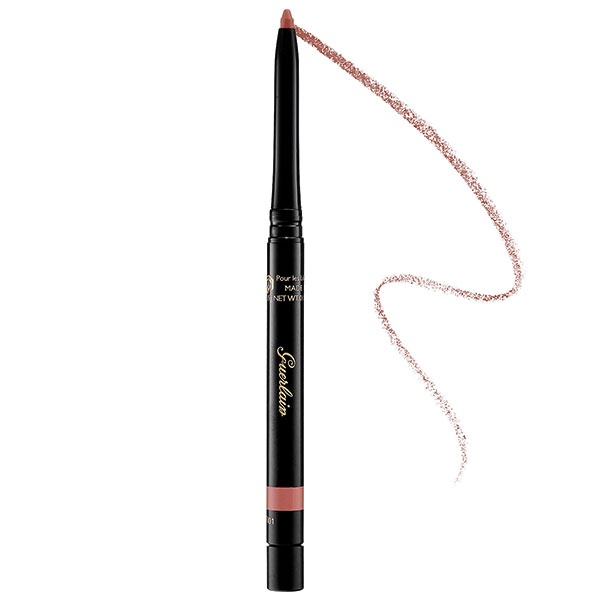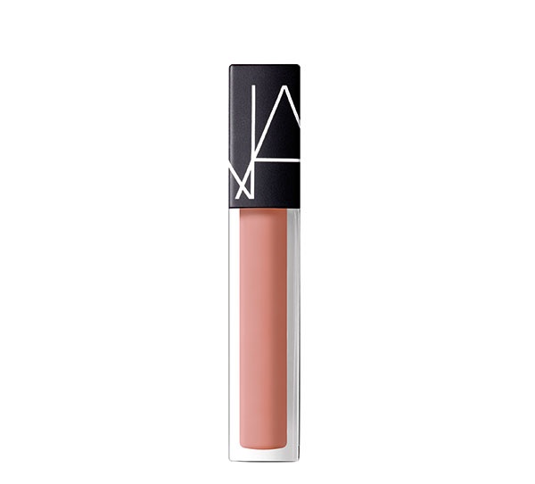 حدّدي شفتيك بقلم بيج وردي Guerlain The Lip Liner in Bois des Indes no.42، وغلّفيهما بأحمر شفاه حيادي مطفأ وطويل الثبات NARS Velvet Lip Glide in Unlaced.