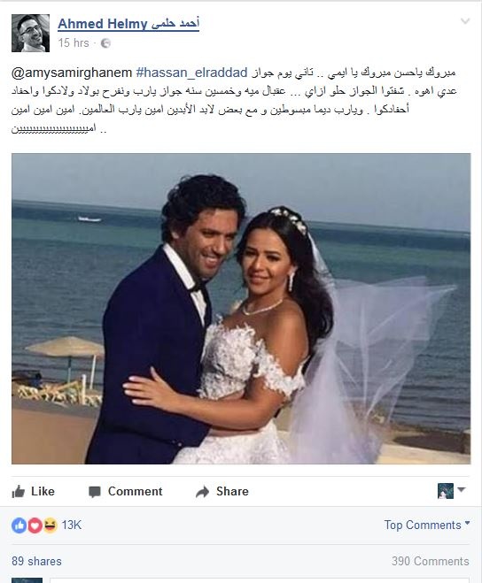 نشر حلمي صورة للزوجين وعلق عليها قائلاً: "مبروك يا حسن مبروك يا ايمي.. تاني يوم جواز عدى اهوه . شفتوا الجواز حلو ازا.. عقبال ميه وخمسين سنه جواز يا رب ونفرح بولاد ولادكوا واحفاد أحفادكوا".