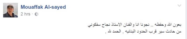وقال السيّد في منشور شاركه عبر حسابه على موقع التواصل الاجتماعي "فيسبوك": "بعون الله وحفظه .. نجونا انا والفنان الاستاذ نجاح سفكوني من حادث سير قرب الحدود البنانيه . الحمد لله".