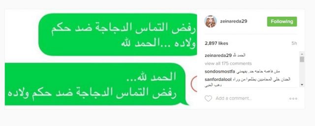 وجاء في صورة نشرتها زينة على حسابها في تطبيق "انستغرام" من مكالمة عبر شبكات التواصل الإجتماعي: "رفض التماس الدجاجة ضد حكم ولاده... الحمد لله".