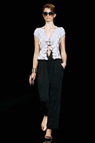 ماذا سنجد عند Giorgio Armani هذا الربيع؟ مجموعة مختلفة عن كلّ ما قدّمه في الماضي، إذ بحث عن التجديد: الكثير من السراويل الواسعة التي تصل إلى الكاحل مع سترات قصيرة بعضها بالسحّابّات، تحتها قمصان بفتحة كبيرة على شكل ٧، تنانير واسعة قصيرة أيضاً وأخرى مع ثنيات، أكمام قصيرة شفّافة، قمصان بطبقات متعدّدة أضاف إليها الباييت، قطع من القماش مقصوصة على شكل مثلثّات ومربّعات صغيرة، فساتين قصيرة حتّى للسهرة، أحزمة عريضة منها ملوّنة، وأحذية دون كعب. Giorgio Armani أعاد الألوان الحقيقيّة إلى خشبات عرض ميلانو، فمزج أقمشة بالأزرق والأخضر، أو الأزرق مع الأسود، أو الأحمر مع الأزرق. كما قدّم الحقائب على شكل clutch، بعدّة أحجام وبألوان مختلفة مثل الأحمر والأخضر والفوشيا.