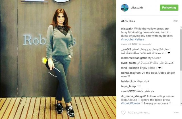 هذا الخبر أثار استياء اليسا، التي ردّت بطريقة غير مباشرة على الموضوع، ونشرت صورتها عبر حسابها الرسمي على "انستغرام"، وكتبت: "في الوقت الذي تفبرك به الصحافة الصفراء أخباراً عني، أنا موجودة في دبي أستمتع بأوقاتي مع أصدقائي المفضلين".