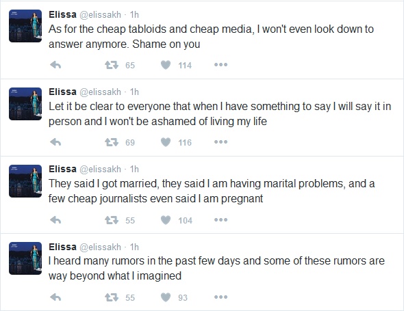 وغرّدا اليسا عبر حسابها على "تويتر": "وصلتني شائعات كثيرة في الأيام الأخيرة، بعضها فاق قدرتي على التصوّر. قالوا أنني تزوّجت، وأنني أواجه مشكلات زوجية، حتى أنّ بعض الصحافيين الرخيصين قالوا أنني حامل".