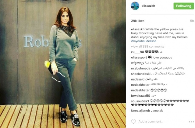 وفي ردها الأول نشرت المطربة اللبنانية صورة عبر حسابها على تطبيق "انستغرام" معلقةً باللغة الانكليزية: "بينما الصحافة الصفراء مشغولة بفبركة الأخبار عني، أنا في دبي استمتع بوقتي مع أصدقائي المفضلّين".