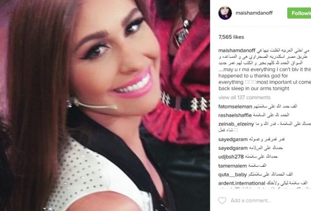 وكتبت ميس عبر حسابها على تطبيق "انستغرام": "مي أختي العربية اتقلبت بيها في طريق مصر إسكندرية الصحراوي هي والمساعدة والسواق الحمد لله كلهم بخير واتكتب لهم عمر جديد".