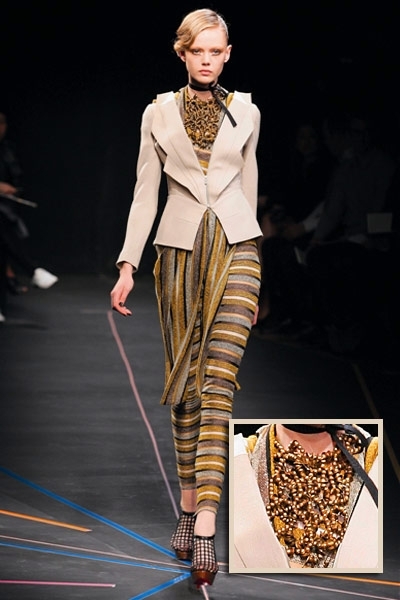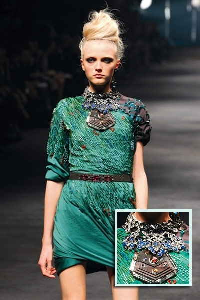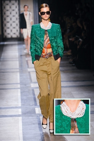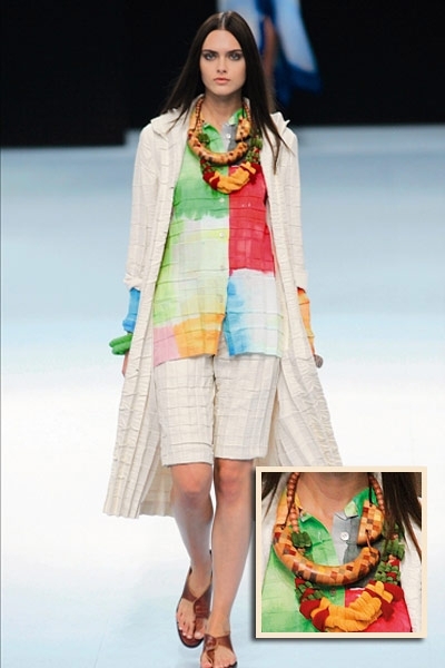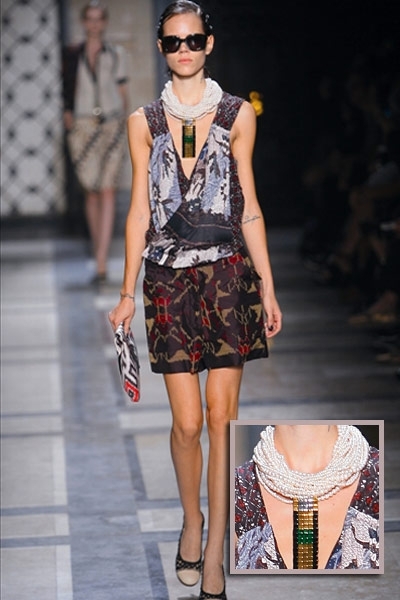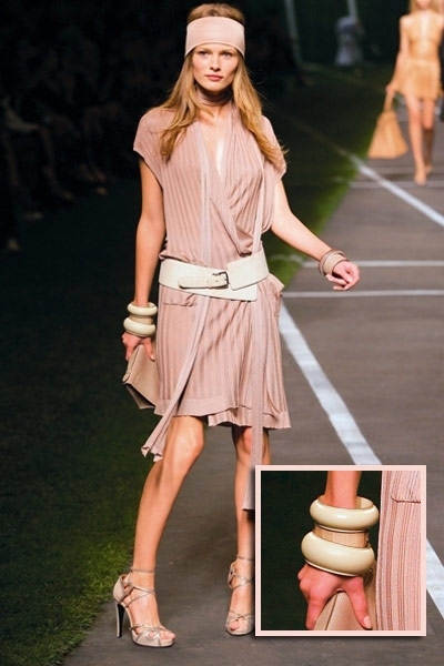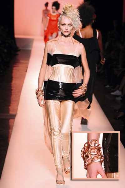 متكتّل ومكتنز، من سمات العقد الذي حضر على منصة هذا الموسم . مع دار لانفين، «التشوكر» الهندي القصير الذي جاء أشبه بأصفاد معدنية مرصعة بالأحجار البراقة والمعدن المعتّق. أما دار مورّي فقلاداتها نسجت اللون النحاسي المتشابك والذي أصاب أكسسوار الأساور بقشعريرة رائعة بلغت الذراع أحياناً. ولم تعرف الأساور سمة الكلاسيكية مع دار شانيل، فهي منقوشة بشفافية بالزهور الزاهية وكذلك الداكنة التي أثارت الصخب خصوصاً مع الأوشام الموقتة. أما دار هرميس، فاستخدمت أكثر من مادة لإكسسوارها كالمعدن والبلاستيك والخشب. الأساور المتلاحقة والمطوّقة للمرفق بالإضافة إلى السلاسل المعدنية الطويلة الكلاسيكية التي تناقضت وتناسقت مع أكسسوار عالم البوب. وانفردت دار دريز فان نوتن بالسوار المعدني العريض، «الكفّة» المرصّعة بالأحجار الملوّنة والطوق اللؤلؤي الذي تدلّت منه جوهرة مزخرفة. اللآلئ المرصعة بوفرة للمرفق، كانت خيار جون غاليانو، وقد حاكت استدارتها الأزياء المنقّطة.