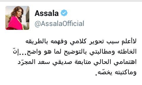 وكتبت أصالة في تغريدة جديدة: "لا أعلم سبب تحوير كلامي وفهمه بطريقة الخاطئة ومطالبتي بالتوضيح لما هو واضح. إن إهتمامي الحالي متابعة صديقي سعد لمجرد وما كتبته يخصه".