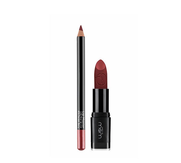 حددي شفتيك وابرزيهما بقلم مطابق للون أحمر الشفاه القشدي الدافىء من الماركة نفسها Wow by Wojooh Masters the Art of the Lip in A Dark Look.