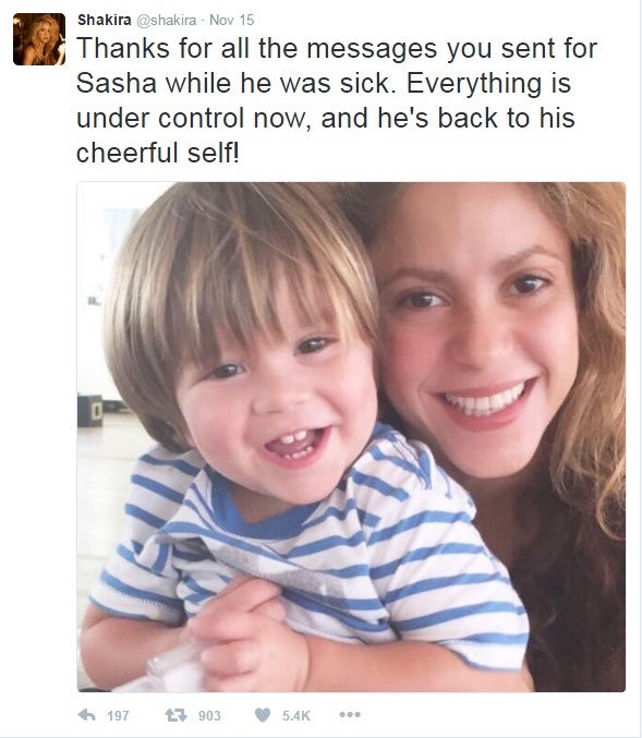 وكان طفل شاكيرا من لاعب كرة القدم الإسباني جيرارد بيكي، ساشا يُعاني من مرضٍ لم يتمّ الاعلان عنه.