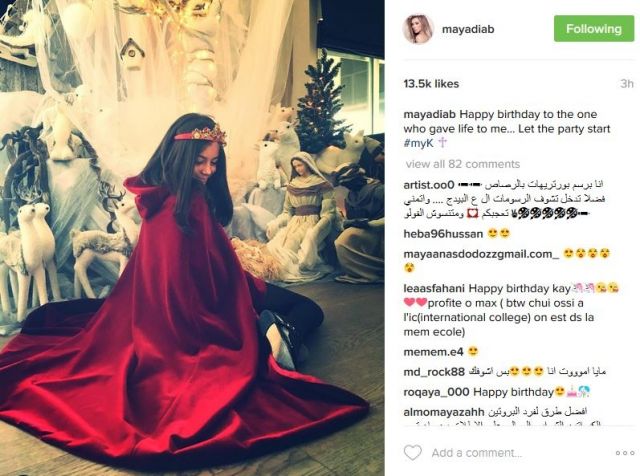 نشرت دياب على "انستغرام" صورة لابنتها وهي ترتدي فستان سندريلا أحمر من المخمل مع تاج أحمر مزين بأحجار في الوسط.