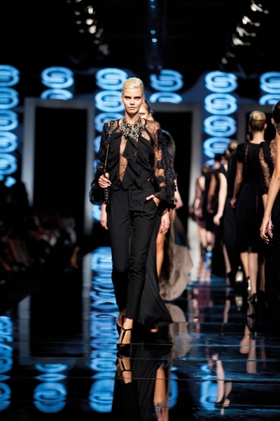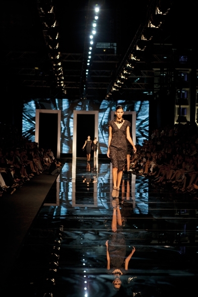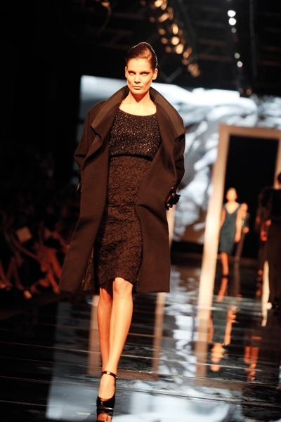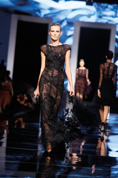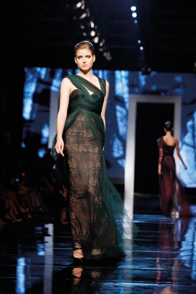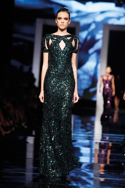 بعد ساعة ونصف الساعة من الإنتظار، بدأ العرض. فحبس جمهور فاق عدده 1500 شخص أنفاسه، منتظراً إطلالة العارضات، عارضة بعد عارضة، في تصميم بعد تصميم، حلم بعد حلم. الصمت التام دليل واضح على تماهي هذا الجمهور في كلّ تفصيل من تفاصيل المجموعة التي طغى عليها اللون الأسود، وزادها الدانتيل رومانسية وغموضاً. قصّات واضحة المعالم تنحت الجسم وتحدّده. أقمشة غنيّة ترواحت بين الكريب الصوفي والجرسيه والموسلين والجورجيت والتول، تنبض أنوثة. ألوان شتوية رمادية ورمّانية وخضراء داكنة وزرقاء ملكية، إضافة الى البيج الموتارد لون الموسم. وقد كان لافتاً في هذه المجموعة عودة حشوة الكتف Epaulettes، والورود المشغولة من قماش الموزّعة فوق الفساتين. كذلك لفت تضمين المجموعة عدداً كبيراً من الفساتين العملية الأنيقة والأنسمبلات الرسمية وجاكيتات الفرو القصيرة المترفة، إلى جانب فساتين السهرة المشكوكة بالبرق التي عُرف بها صعب.