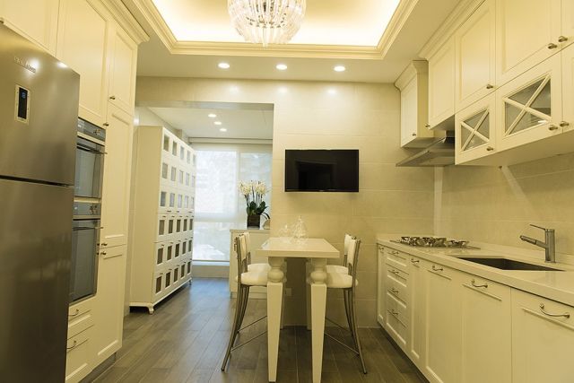 خشب أبيض فاخر يميل إلى الكلاسيكية في تصميمه، أعطى رونقاً خاصاً للمطبخ الذي يصلح أن يكون جزءاً من قاعات الاستقبال نظراً الى أناقته اللافتة.