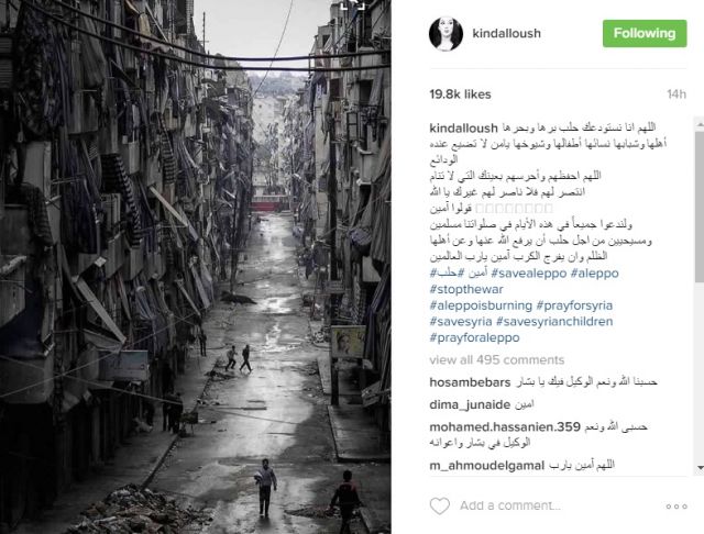 ومن الفنّانات السوريّات التي تضامنت مع حلب، الممثّلة السورية كندة علّوش، التي كتبت على "انستغرام": "اللهم انا نستودعك حلب برها وبحرها أهلها وشبابها نسائها أطفالها وشيوخها يامن لا تضيع عنده الودائع.. اللهم احفظهم وأحرسهم بعينك التي لا تنام.. انتصر لهم فلا ناصر لهم غيرك يا الله.. قولوا آمين. ولندعوا جميعاً في هذه الأيام في صلواتنا مسلمين ومسيحيين من اجل حلب أن يرفع الله عنها وعن أهلها الظلم وان يفرج الكرب آمين يا رب العالمين."