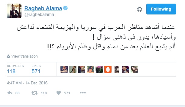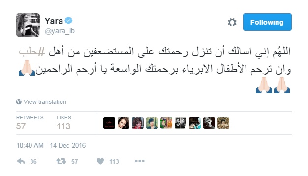 كما تعاطف فنّانون لبنانيّون مع أهالي حلب، فغرّدت يارا: " اللهُم إني اسالك أن تنزل رحمتك على المستضعفين من أهل حلب وان ترحم الأطفال الابرياء برحمتك الواسعة يا أرحم الراحمين." فيما غرّد الفنّان راغب علامة: "عندما أشاهد مناظر الحرب في سوريا والهزيمة الشنعاء لداعش وأسيادها، يدور في ذهني سؤال! ألم يشبع العالم بعد من دماء وقتل وظلم الأبرياء ؟!!"