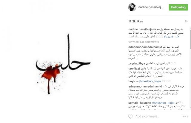 ونشرت الممثّلة اللبنانيّة نادين نسيب نجيم، صورة حلب، وكتبت: "يا رب إرحم عبيدك وإرحم جميع الشهداء في كل البلاد العربية... يا رب انت الوحيد القادر على وقف سفك الدماء."