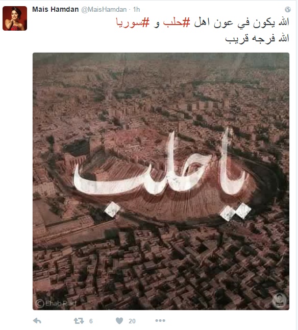 وغرّدت الممثّلة الأردنيّة ميس حمدان، وكتبت: "الله يكون في عون اهل حلب وسوريا.. الله فرجه قريب".