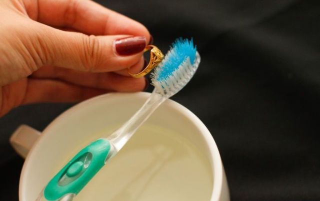 إنقعي مجوهراتك لمدّة دقيقة واحدة في وعاء يحتوي على الماء والصابون. أفركيها بلطف بواسطة فرشاة أسنان ثمّ اغسليها بالماء الفاتر.