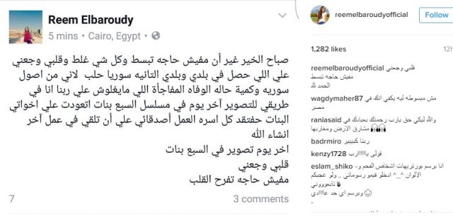 وأضافت: "انا في طريقي للتصوير آخر يوم في مسلسل السبع بنات اتعودت علي اخواتي البنات حفتقد كل اسره العمل أصدقائي علي أن تلقي في عمل آخر ان شاء الله".