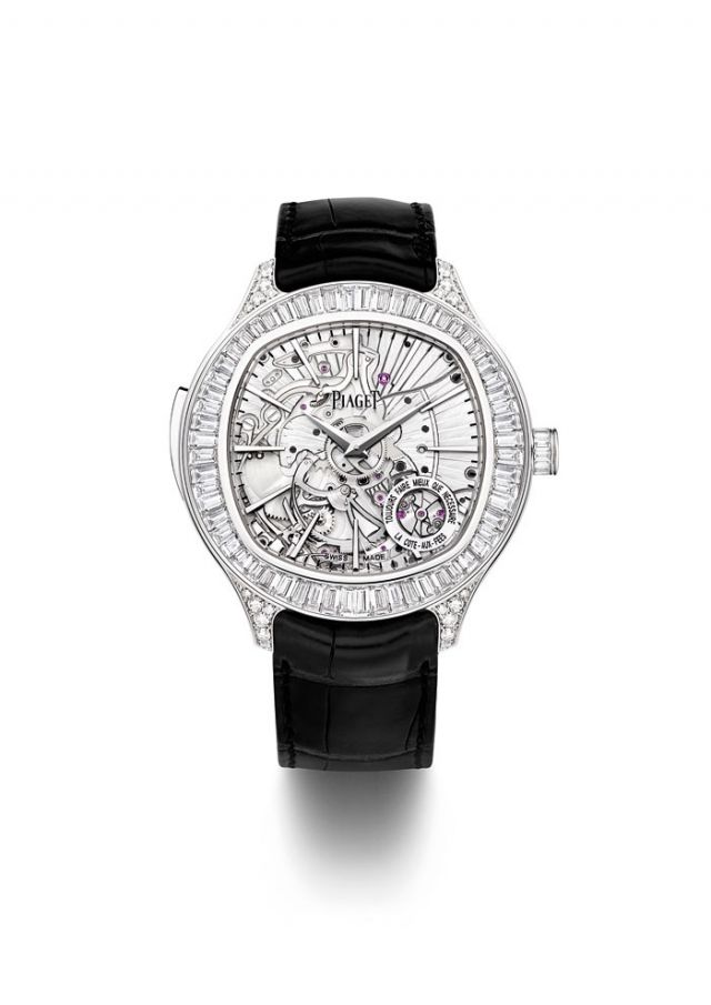 ♦ساعة Emperador Coussin XL من Piaget مرصّعة بـ 260 حبة ألماس متلألئة و60 حبة ألماس بتقطيع الباغيت على علبة وسادية من الذهب الأبيض عيار 18 قيراطاً.