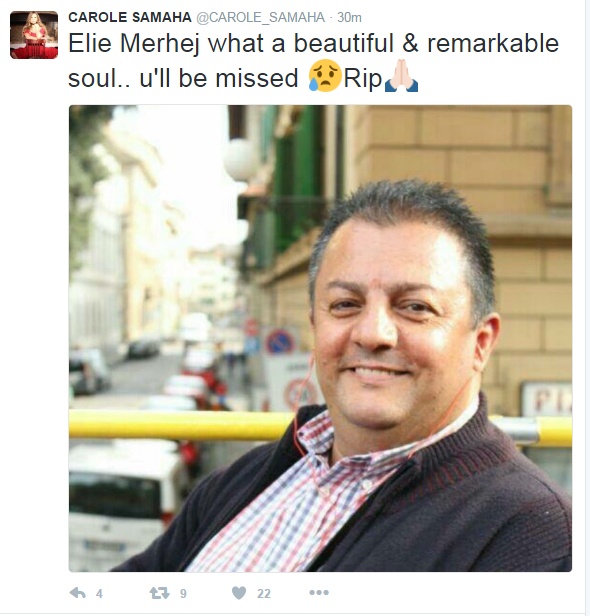 وكانت الفنّانة اللبنانية كارول سماحة غرّدت: "أنا حزينة جداً لخسارة فرد عزيز من فرقتي الموسيقية. ايلي مرهج شخص رائع ومميز. رحمه الله".