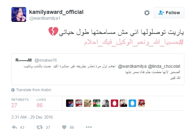 فسّرت المتسابقة الجزائرية كاميليا ورد التي خرجت من برنامج Arab Idol وفق ما يطيب لها، طلب النجمة الإماراتية أحلام بطلب السماح من جميع الناس مع اقتراب نهاية عام 2016 الجاري.