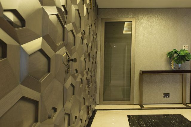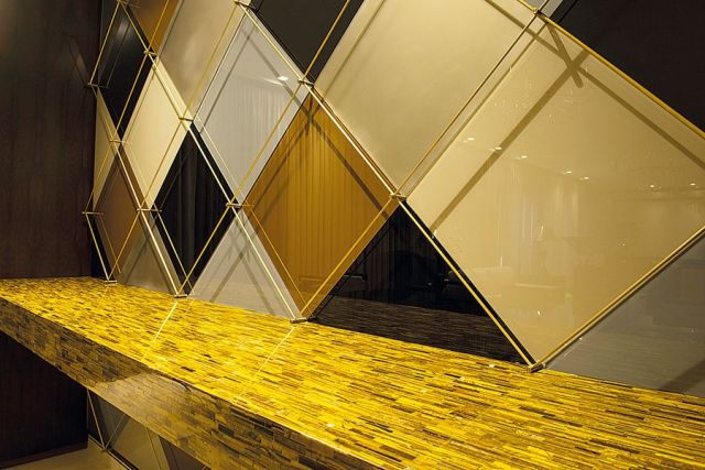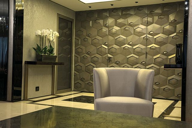 الأرض لوحة فنية، مزيج من الرخام البيج والأسود، قابلتها لوحة بالخيوط المتناسقة نفسها في السقف الذي تزيّن بالزجاج البيج والأسود أيضاً مثل تصميم الأرض.