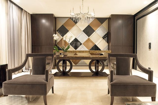 وبالوصول إلى غرفة الطعام بتصميمها غير المألوف، فقد بدت قطعةً قائمةً في ذاتها أرخت بلمستها الفريدة وتفنّنها جواً ساحراً على قاعات الاستقبال. فالحائط الذي توسّط الخزانتين الخشب يميناً ويساراً، لبس المرايا المطلية من الخلف على شكل مربعات تراوحت ألوانها بين البنيّ والبيج، زخرفتها أقلام من النحاس متّصلة وكأنّها تطير أو تشكّل المستوى الأمامي للمرايا.