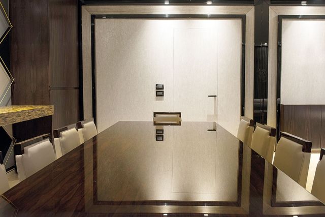 أما خشبها، فمنه المطفأ واللمّاع من نوع الـ«زيريكوت». مطفأ للخزائن ولمّاع لطاولة، قاعدتها عبارة عن دائرتين على شكل دولاب استقلتا على قطعة خشب. أما المقاعد فهي من الجلد الطبيعي والخشب اللمّاع كما الطاولة التي تدلّت فوقها ثريا بتصميم أنيق كانت المالكة تحتفظ بها.