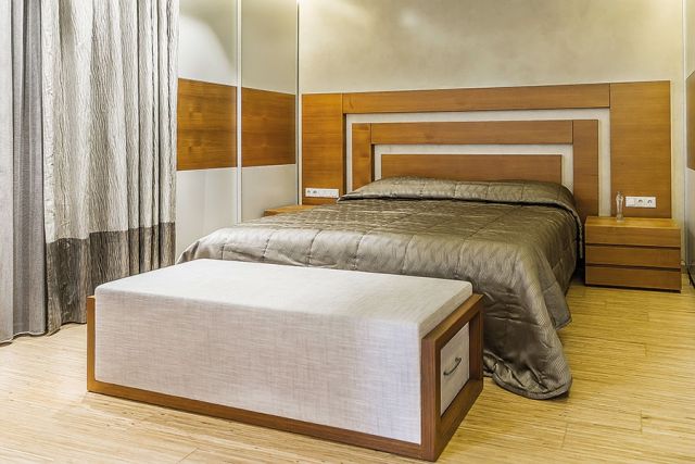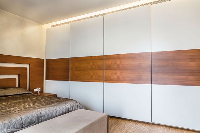 غرفة النوم أنيقة التصميم وعملية، استُخدم فيها نوعان من الخشب. ظهر السرير عبارة عن أقلام من الخشب البيج الزاهي امتزج مع الخشب الأبيض، كالخزانة التي احتلت طول الجدار بلونها الأبيض، وتوسطتها مستطيلات من الخشب بلون خشب السرير. أما الستائر فصُمّمت بالرمادي الزاهي والداكن، وهو ما أدخل لمسة ذوق خاصة عليها.