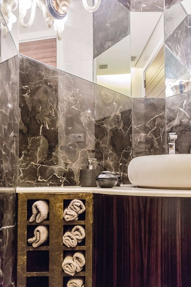 الجوّ الأنيق انسحب أيضاً على حمّام الضيوف من الرخام الأسود، وتزيّن بمرايا بأشكال هندسية وُضعت على الجدران وهدفت إلى تكبير المساحة وتزيينها في آن معاً.