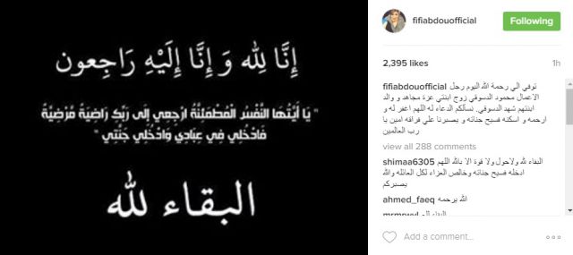 شاركت الراقصة المصرية فيفي عبده، محبّيها حزنها بوفاة زوج ابنتها عزة مجاهد، رجل الأعمال محمود الدسوقي.