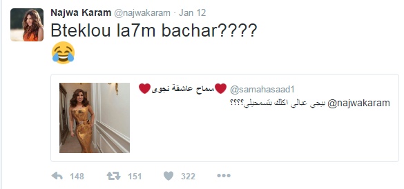 وردّت كرم على تغريدة المستخدمة "سماح عاشقة نجوى كرم" على "تويتر": "بيجي عبالي آكلك بتسمحيلي؟"، قائلةً: "بتاكلوا لحم بشر؟".