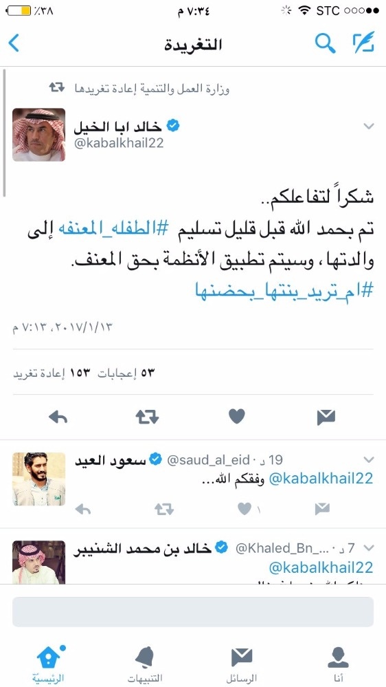 بعد أقل من 4 أيام على طرح موضوع الطفلة المعنَّفة من قبل والدها، سلمت الشؤون الاجتماعية قبل قليل الطفلة لوالدتها، بعد خضوعها للكشف الطبي، وأعلن المتحدث الرسمي لوزارة العمل والتنمية الاجتماعية، خالد أبا الخيل، أنه تم بحمد الله قبل قليل تسليم الطفلة لوالدتها، وسيتم تطبيق الأنظمة بحق والدها المعنِّف.
