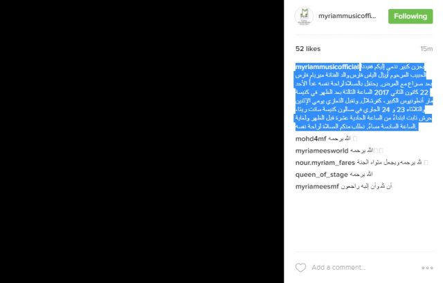 أعلن حساب الشركة المنتجة وإدارة أعمال الفنّانة اللبنانية ميريام فارس على "انستغرام"، وفاة والد النّجمة.