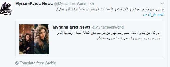 وغرّدت: "الى كل من يتداول هذه الصورة،، فهي من مراسم دفن الفنانة صباح رحمها الله و ليس من مراسم دفن والد ميريام فارس رحمه الله".