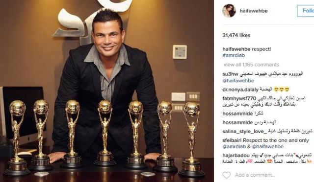 شاركت وهبي جمهورها على "انستغرام" بصورة لـ"الهضبة" وأمامه مجموعة من الجوائز التي حصل عليها خلال مشواره الفني وعلقت عليها بكلمة وحيدة "احترام".
