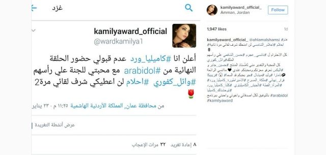 كاميليا، وعبر حسابها على التويتر خرجت بتغريدتين قالت في الأولى: "أعلن انا #كاميليا_ورد عدم قبولي حضور الحلقة النهائية من #arabidol مع محبتي للجنة على رأسهم #وائل_كفوري #احلام لن اعطيكي شرف لقائي مرة ثانية".