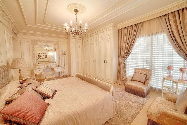 وفي غرف النوم، لا تقل الاعمال روعةً، حيث يعكس طرازها الرفاهية والفخامة الممزوجين بالحرفية النادرة. فالأسرّة في هذه الغرف تتميز باللون الأبيض الضارب الى البيج، ويتناغم خشبها مع الخزائن التي تبرز كمنحوتات فخمة بلون أبيض لؤلؤي مطعّم بزخرفات وردية.